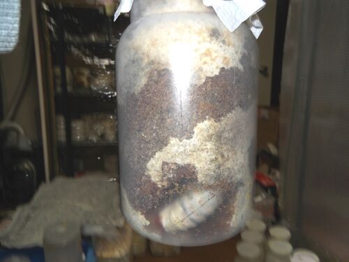 ババオウゴンオニクワガタ幼虫の菌糸ビン(カワラ菌糸)交換。 8/20:プリン450㏄⇒11/12:12.4g PP1100⇒12/24:18.2g PET1400cc 入れ替えの経緯は上記の通りですが、4か月で18g、♂だと思いますが、大きくなりません。