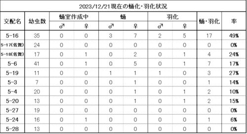 現在、今年の春に採取した幼虫の内、早いもの(早期)が♀を中心に羽化が始まっています。この早期羽化ですが、特定のペアからの子が集中するように羽化してきています。この傾向は、昨年も感じていた事です。 現在の羽化状況をまとめてみました。 上表のよう…