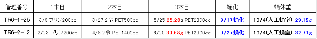 TR6-1及びTR6-2ラインより、各1頭を掘り出し、蛹の体重測定を行ったのが以下の結果です。