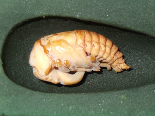 ただ、容器の外から、少しだけ大きそうな蛹が蛹化していましたので、体重測定を兼ねて、人工蛹室に移しました。