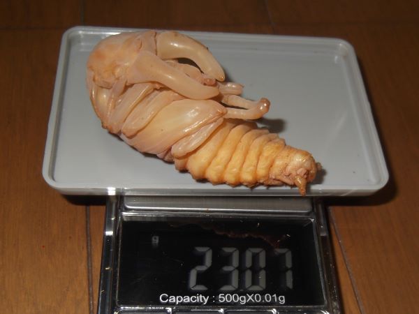 ※我が家のタランドゥスにおける、「蛹体重-成虫サイズ」の関係からは、23gなら77㎜程度かと思われますが、上蛹の写真のように顎が前方に伸びているので、サイズ的には、もう少し大きくなると思われます。